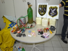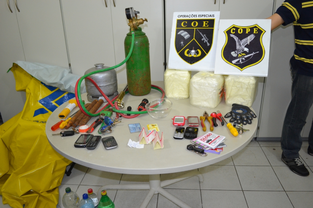 A polícia apreendeu dentro dos dois veículos, vários objetos que seriam utilizados na ação, dentre eles, um maçarico, isopor e armações em acrílicos que serviriam para burlar os sensores de presença, além de uma lona com a marca do banco, para impedir que fossem vistos durante a ação. “Nós já investigávamos a quadrilha há mais de três meses. São perigosos e inclusive teriam pago propina para fugir do presídio de Mato Grosso, de onde saíram pela porta da frente. Esse elementos são audaciosos e organizados”, disse.